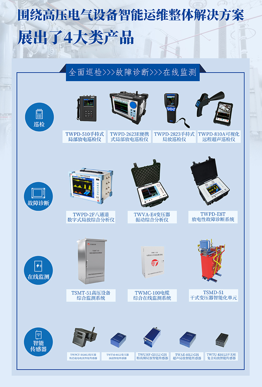 在這兩場均是千人規(guī)模的專業(yè)人士大會上,我司攜帶展出產品陣容強大。圍繞高壓電氣設備智能運維整體解決方案從巡檢、故障診斷、在線監(jiān)測三個環(huán)節(jié)展出了四大類產品。