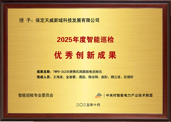 會議期間,發(fā)布2025年智能巡檢技術(shù)應(yīng)用與創(chuàng)新成果名單,天威新域“TWPD-2623E便攜式局部放電巡檢儀”通過專委會資料審查、專家初審、終審答辯等環(huán)節(jié),獲評“2025年智能巡檢技術(shù)應(yīng)用與創(chuàng)新成果”。