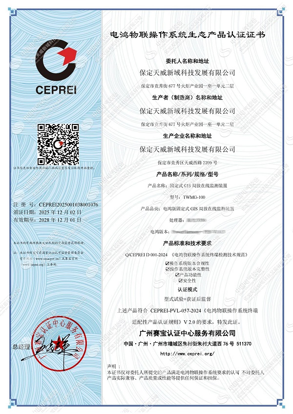 12月2日,保定天威新域科技發(fā)展有限公司自主研發(fā)的TWMG-100 固定式GIS局部放電在線監(jiān)測裝置,正式通過南方電網(wǎng)電鴻物聯(lián)操作系統(tǒng)生態(tài)產(chǎn)品認(rèn)證,成為實現(xiàn)"硬件+操作系統(tǒng)+應(yīng)用軟件"國產(chǎn)化的監(jiān)測裝備。這一突破標(biāo)志著我國電力設(shè)備狀態(tài)監(jiān)測技術(shù)擺脫對國外基礎(chǔ)軟件的依賴,為新型電力系統(tǒng)建設(shè)提供了自主可控的方案。