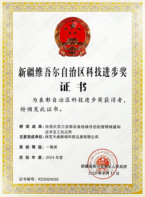 保定天威新域科技發(fā)展有限公司完成的“油浸式變壓器類設(shè)備絕緣狀態(tài)的寬頻域感知技術(shù)及工程應(yīng)用”項(xiàng)目,榮獲新疆維吾爾自治區(qū)科技進(jìn)步一等獎(jiǎng)。