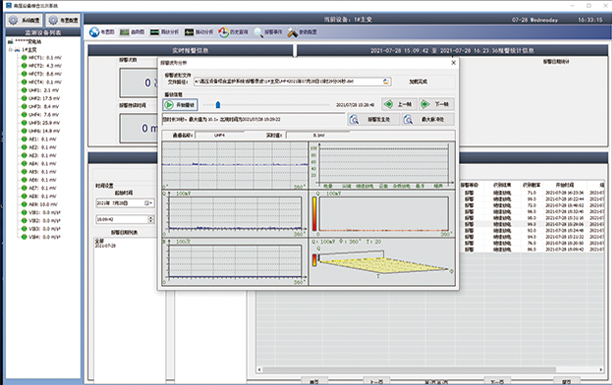 綜合監(jiān)測(cè)后臺(tái)具備局部放電圖譜的展示功能,裝置告警后應(yīng)可調(diào)取告警前一個(gè)周波起的1個(gè)工頻周期時(shí)長(zhǎng)的時(shí)域波形,以及告警前后各30分鐘內(nèi)的局放圖譜。